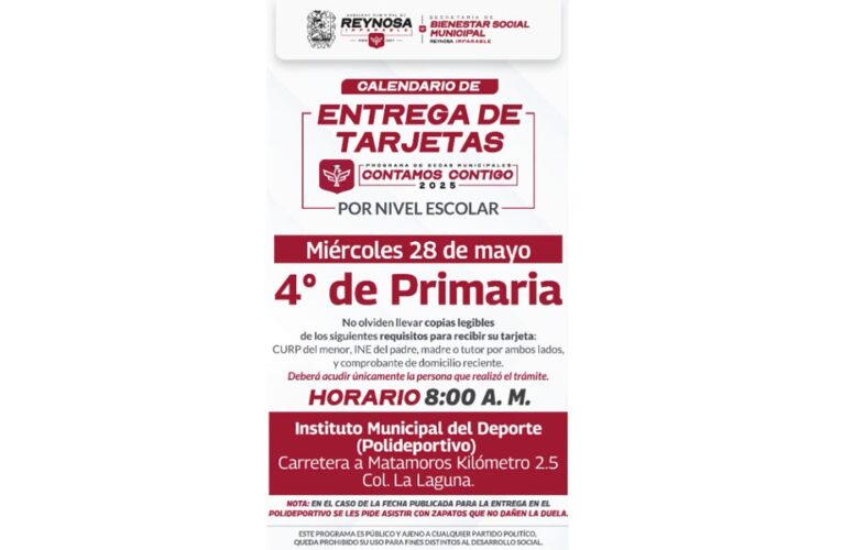 Reynosa, Tam.- Este miércoles 28 de mayo, el Presidente Municipal Carlos Peña Ortiz hará entrega de las Tarjetas del Programa de Becas Municipales «Contamos Contigo» 2025 a padres y tutores … Leer más