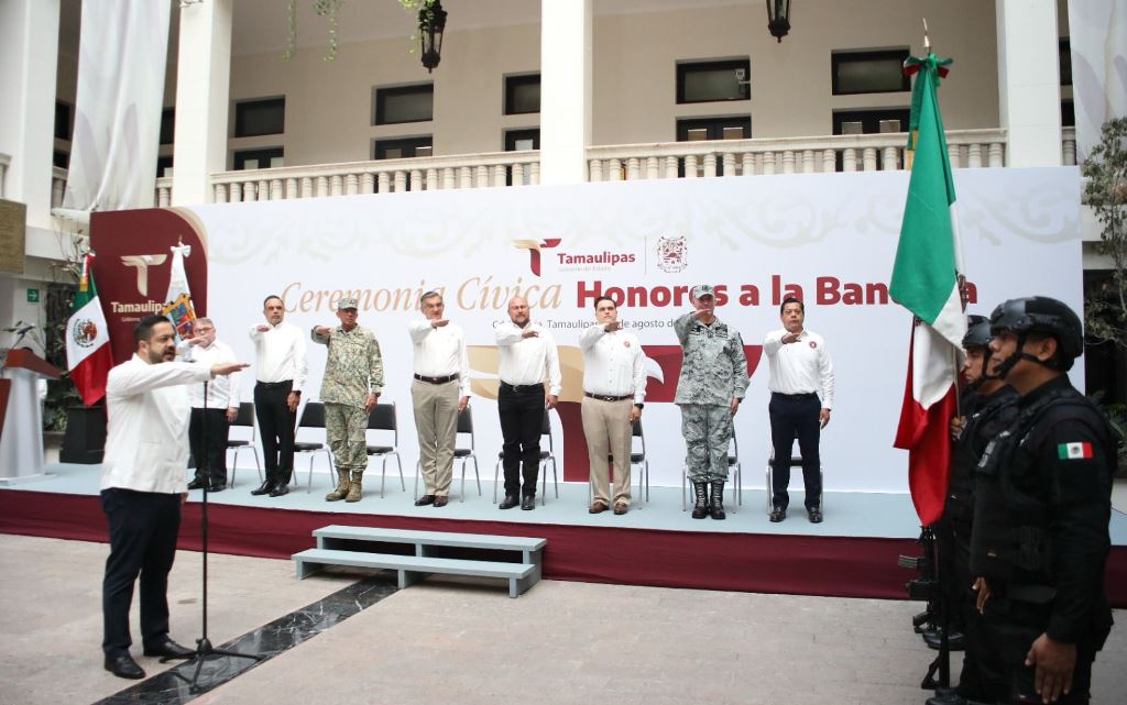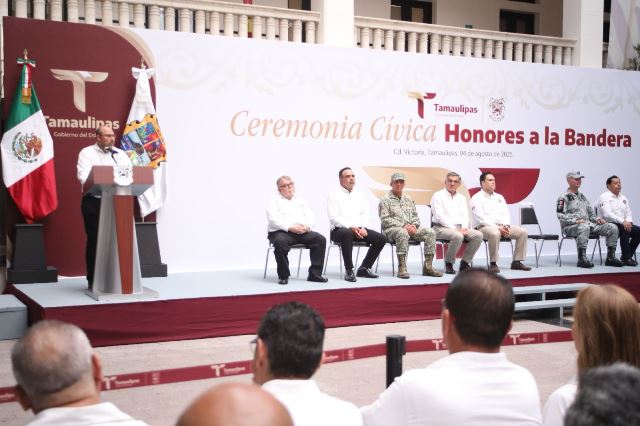 Al dar la bienvenida a la ceremonia cívica, Héctor Joel Villegas González, secretario General de Gobierno, hizo un llamado a las y los servidores públicos para seguir el ejemplo del gobernador Américo Villarreal y demostrar que “servir a Tamaulipas no es una tarea de escritorio, sino una causa que se lleva con orgullo, entrega y honestidad”.