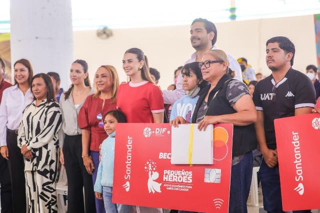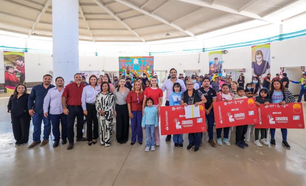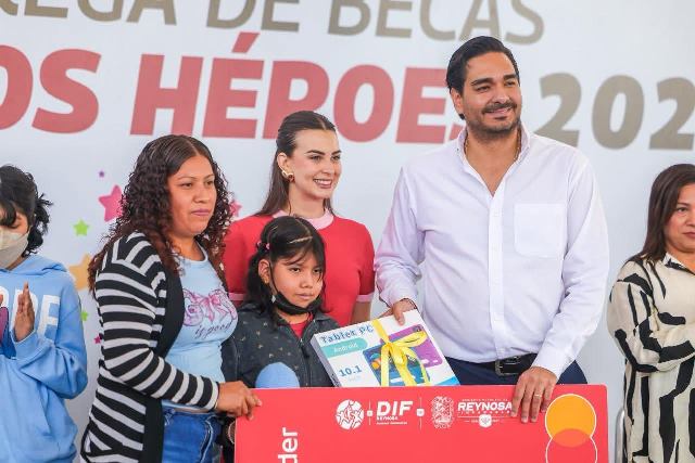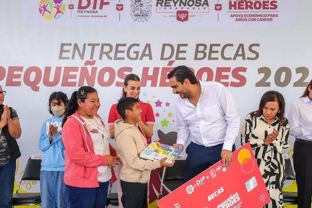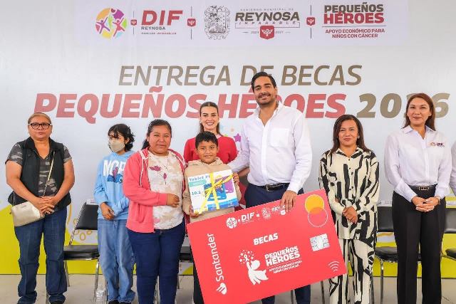 Reynosa, Tam.- El Alcalde Carlos Peña Ortiz acompañado por su esposa la Presidenta del Voluntariado DIF-Reynosa, Alejandra Yelitza Garza, encabezó la Entrega de Becas Pequeños Héroes 2026, los apoyos económicos para niños con cáncer.