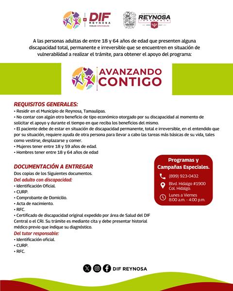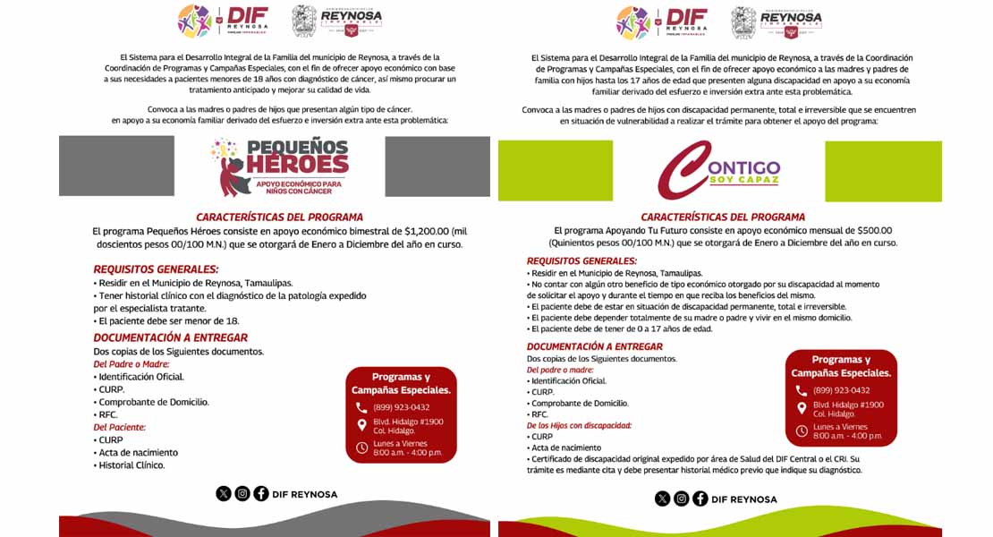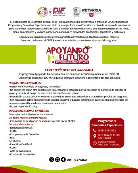 Las becas «Contigo Soy Capaz», «Avanzando Contigo», «Apoyando Tu Futuro» y «Pequeños Héroes» del DIF-Reynosa, forman parte del compromiso permanente del Alcalde, Carlos Peña Ortiz, de apoyar a las familias que enfrentan situaciones de vulnerabilidad, por lo que se invita a estar atentos a las fechas correspondientes.