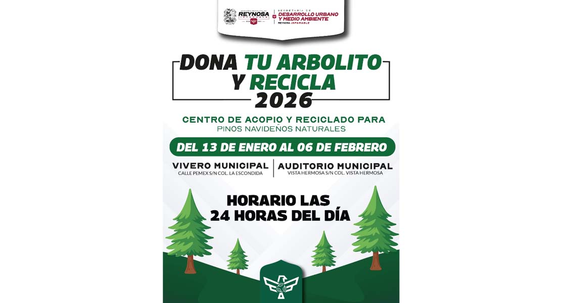 Reynosa, Tam.- El Gobierno Municipal de Reynosa, que preside Carlos Peña Ortiz, pondrá a disposición de la población en general dos Centros de Acopio y Reciclado de árboles navideños, a partir del 13 de enero hasta el 6 de febrero.