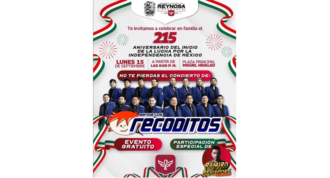 Reynosa, Tam.- El Presidente Municipal Carlos Peña Ortiz invita a la población a conmemorar el 215 Aniversario del Inicio de la Lucha por la Independencia de México y disfrutar la música de la Banda Los Recoditos, este 15 de septiembre en la plaza principal Miguel Hidalgo a partir de las 6:00 de la tarde.