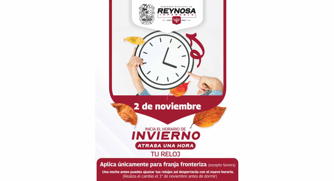 En Reynosa volvemos a la hora que rige a la mayor parte del país, y este domingo es el cambio que por comodidad puedes adelantar la noche de hoy, ajusta tus relojes y revisa tus dispositivos electrónicos, el Gobierno Municipal de Reynosa te desea un excelente domingo.