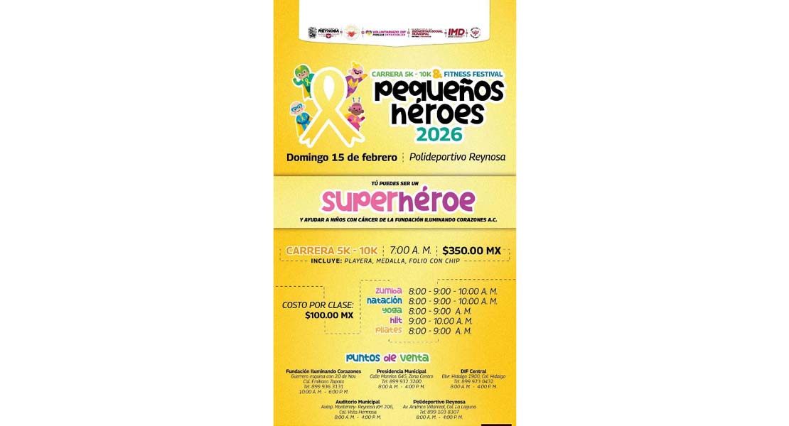 Conviértete en un superhéroe y corre por una gran causa, prepárate para la Carrera 5K-10K & Fitness Festival Pequeños Héroes 2026, que se llevará a cabo en el Polideportivo Reynosa, El domingo 15.de febrero a partir de las 7:00 de la mañana.