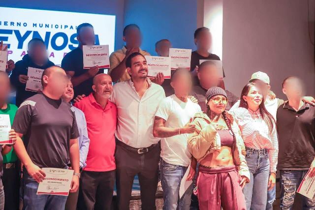 Reynosa, Tam.- El Presidente Municipal Carlos Peña Ortiz, acompañado por la campeona mundial de box Mariana «La Barbie» Juárez, entregó reconocimientos a una nueva generación de egresados del programa social Tazo Dorado, que impulsa una nueva vida con más oportunidades para quienes sufre de problemas de adicción.