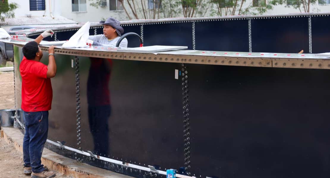 Reynosa, Tam.- La Comisión Municipal de Agua Potable y Alcantarillado de Reynosa continúa con los trabajos de construcción del Tanque Cisterna Superficial de Vidrio Fusionado al Acero en la Planta Potabilizadora Rancho Grande, una obra estratégica para fortalecer el sistema de abastecimiento de agua potable en la ciudad.