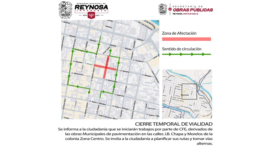 Reynosa, Tam.- El R. Ayuntamiento de Reynosa informa que el próximo jueves 28 de agosto, la Comisión Federal de Electricidad, CFE, llevará a cabo trabajos en la red eléctrica en las calles J. B. Chapa y Morelos, en la Zona Centro a partir de las 6:00 A. M., hora en que será suspendido el servicio de energía.