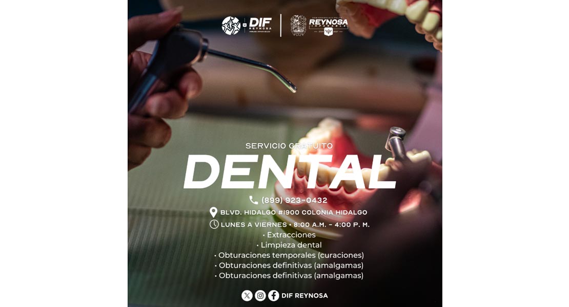 Gracias al respaldo del Alcalde, Carlos Peña Ortiz y DIF-Reynosa, se garantiza el acceso a servicios de salud bucal, en especial para los sectores más vulnerables; para mayores informes, pueden comunicarse al 899923-0432 a partir del 04 de agosto.