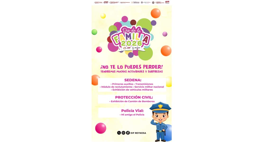 Reynosa, Tam.- El Alcalde, Carlos Peña Ortiz, a través del Sistema DIF Municipal que preside Carlos Luis Peña Garza, llevará a cabo el Día de la Familia, un evento especial con música, alegría y mucha diversión enfocado en fortalecer los lazos de amor y cariño con los seres queridos.