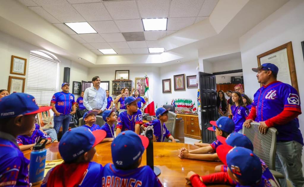 Reynosa, Tam.- En Reynosa, el Alcalde Carlos Peña Ortiz brinda el apoyo incondicional de su Gobierno, para que niños y jóvenes, hombres y mujeres sigan trayendo triunfos de todos los deportes en cualquier lado del mundo y hoy recibió a jugadores de la Liga Pequeña de Beisbol Treviño Kelly, campeones nacionales de la Serie Williamsport categoría Moyote.