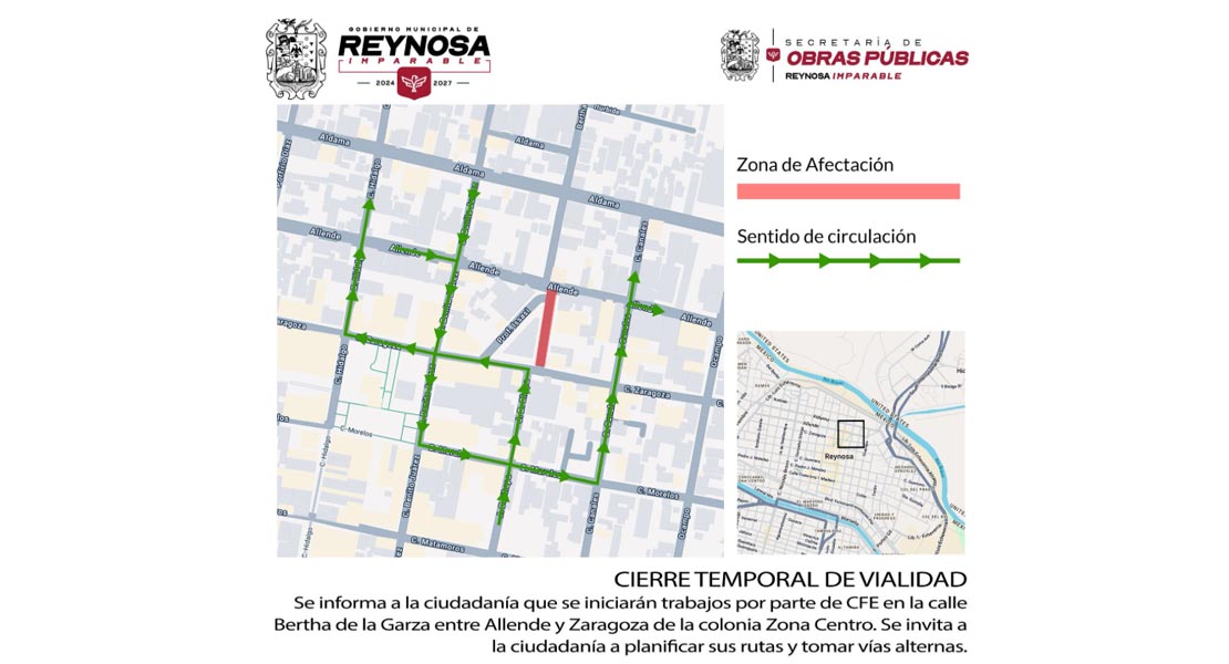 Reynosa, Tam.- El Gobierno Municipal de Reynosa informa a la población que este jueves 14 de agosto la CFE realizará maniobras en la calle Bertha Garza, entre Allende y Zaragoza, así como en la calle Issasi, de la Zona Centro.