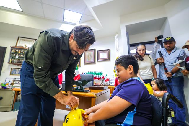 En la oficina principal del Ayuntamiento, el Alcalde recibió a los niños y niñas que representan al Teleton en esta ciudad, a quienes depositó en sus ánforas su donativo y el que hizo a nombre del Gobierno Municipal, contribuyendo a la causa para que más personas sean beneficiadas con las rehabilitaciones que se llevan a cabo en los CRI, Centro de Rehabilitación Integral.