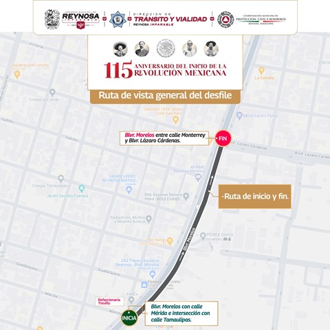 Reynosa, Tam.- El Gobierno Municipal de Reynosa te invita a conocer el cierre temporal de calles en el bulevar Morelos, por el Desfile Conmemorativo del 115 Aniversario del Inicio de la Revolución Mexicana, que se llevará a cabo este jueves 20 de noviembre.
