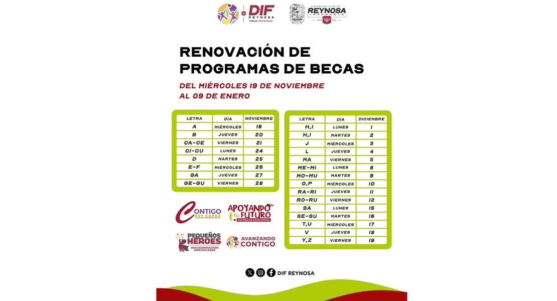 Reynosa, Tam.- El Sistema DIF-Reynosa que preside Carlos Luis Peña Garza, continúa con el proceso de renovación de becas de los programas Contigo Soy Capaz, Apoyando Tu Futuro, Pequeños Héroes y Avanzando Contigo, a fin de apoyar a los menores de edad y adultos mayores con discapacidad, pequeños con cáncer, así como hermanos e hijos que tienen familiares en el Centro de Ejecución de Sanciones.