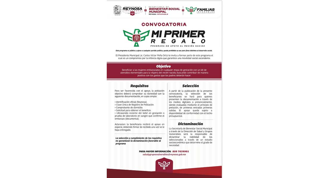 Reynosa, Tam.- El Presidente Municipal Carlos Peña Ortiz convoca a las mujeres embarazadas a inscribirse al programa de la Secretaría de Bienestar Social Municipal «Mi Primer Regalo», dirigido a residentes de esta localidad que podrán recibir el beneficio mediante el cumplimiento de sencillos requisitos.