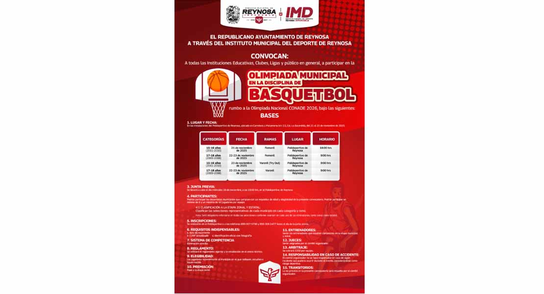 Reynosa, Tam.- El Alcalde Carlos Peña Ortiz hace una atenta invitación a todas las instituciones educativas, clubes, ligas y al público en general, a participar en la Olimpiada Municipal en la disciplina de Basquetbol, rumbo a las Olimpiadas Nacionales CONADE 2026, a través del Instituto Municipal del Deporte.
