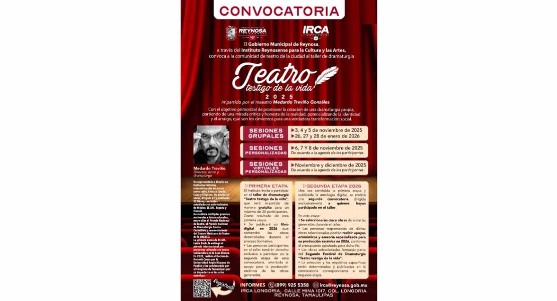 Reynosa, Tam.- El Gobierno de Reynosa, que preside el Alcalde Carlos Peña Ortiz, invita a creadores teatrales a participar en el Taller gratuito “Teatro, testigo de la vida” 2025, impartido por el Maestro tamaulipeco Medardo Treviño González.
