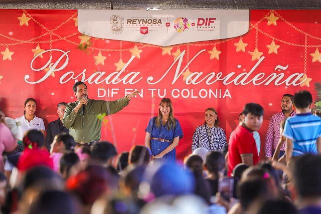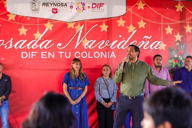 Reynosa, Tam.- La gran Posada DIF En Tu Colonia, 2025, fue encabezada por el Alcalde Carlos Peña Ortiz, acompañado por su esposa Alejandra Yelitza Garza, con el Presidente del Patronato del organismo, Carlos Luis Peña Garza, donde también asistió la Senadora Maki Esther Ortiz Domínguez, quien compartió regalos para las familias.