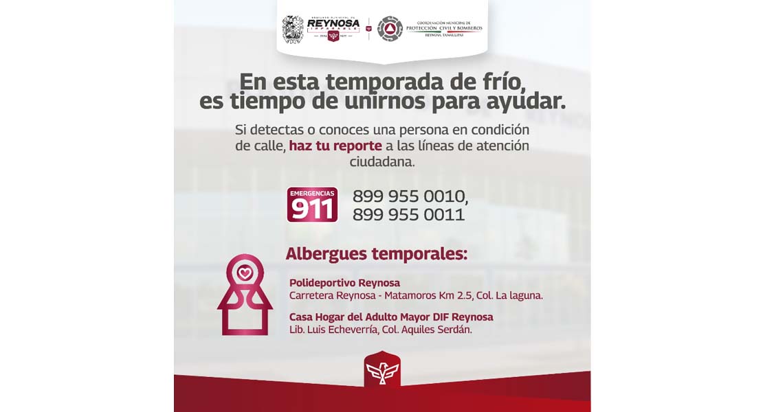 Si detectas a una persona en situación vulnerable ante las bajas temperaturas, repórtala a las líneas de atención de la Coordinación de Protección Civil y Bomberos, para que sea trasladado a un refugio temporal, 8999550010 y 8999550011 o al Número de Emergencia 911.