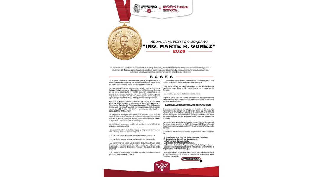 Reynosa, Tam.- El Alcalde Carlos Peña Ortiz hace una invitación a la sociedad reynosense a la Convocatoria Medalla al Mérito Ciudadano «Ing. Marte R. Gómez» 2026, dirigida a aquellas personas originarias o residentes del Municipio que se hayan distinguido por su servicio a nuestra comunidad en sus acciones heroicas, ilustres, cívicas, culturales, educativas, deportivas o ambientales.