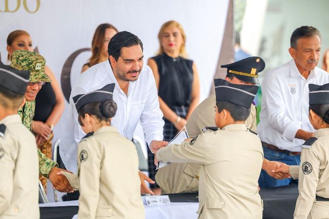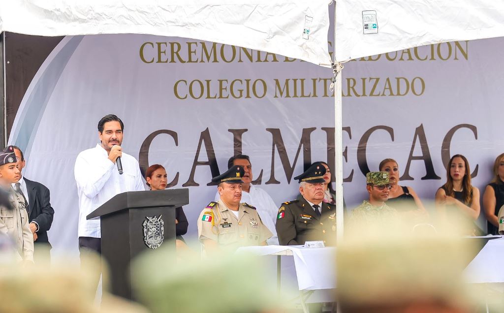 Reynosa, Tam.- Una generación formada en la disciplina, inteligencia y honor celebró gloriosamente a su familia, a Reynosa y a la Patria; cadetes de nivel primaria y secundaria del Colegio Militarizado CALMECAC, recibieron su Certificado de Estudios de manos del Presidente Municipal Carlos Peña Ortiz, así como del Director General de la institución, Capitán Segundo Piloto Aviador, Fernando Alvallar Duarte.