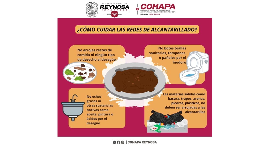Reynosa, Tam.- La Comisión Municipal de Agua Potable y Alcantarillado de Reynosa hace un llamado urgente a la ciudadanía para cuidar las redes de alcantarillado y evitar taponamientos que afectan el servicio en toda la ciudad.