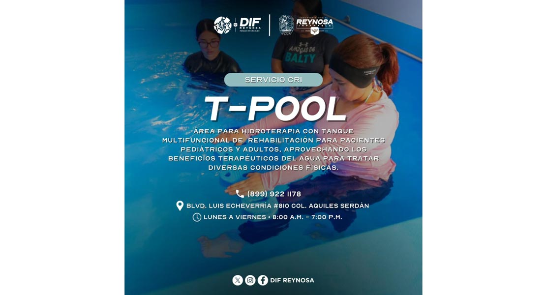Reynosa, Tam.- El Sistema DIF Reynosa que preside Carlos Luis Peña Garza, a través del Centro de Rehabilitación Integral, pone a disposición de la ciudadanía el servicio T-Pool, un espacio de hidroterapia diseñado para atender a pacientes pediátricos y adultos que requieren apoyo en su proceso de rehabilitación.