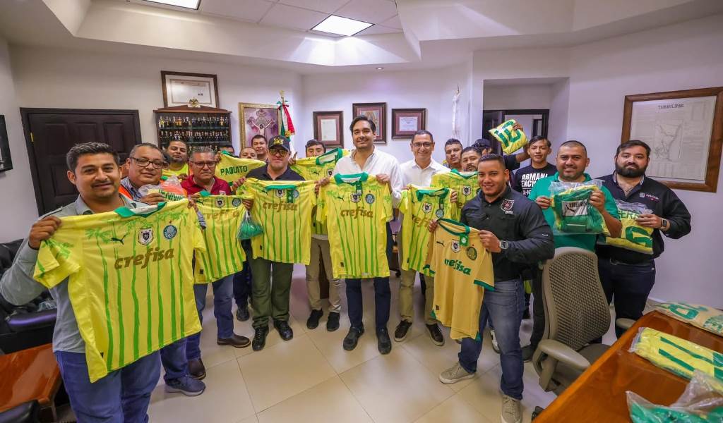 Reynosa, Tam.- El Alcalde Carlos Peña Ortiz entregó uniformes de futbol a integrantes del Sindicato de Trabajadores de Industria, Mantenimiento y Limpieza, con la finalidad de contribuir a su desarrollo deportivo en una actividad de disciplina y salud.