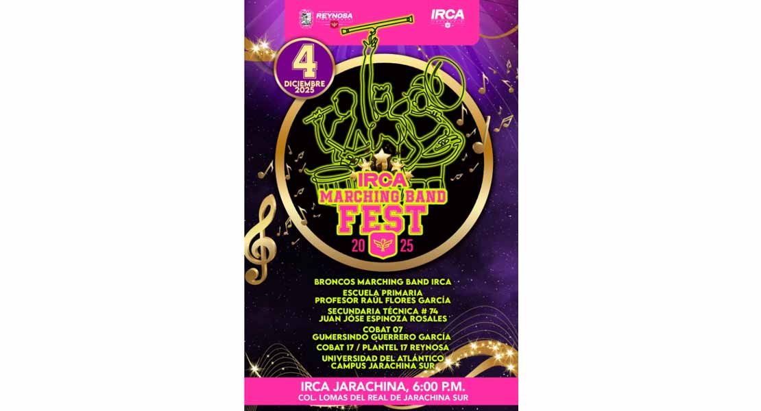 Reynosa, Tam.- El Gobierno de Reynosa, que preside el Alcalde Carlos Peña Ortiz, invita a la comunidad a disfrutar del IRCA Marching Band Fest 2025, un evento que mostrará la energía y el talento de la Broncos Marching Band, junto con agrupaciones escolares invitadas.