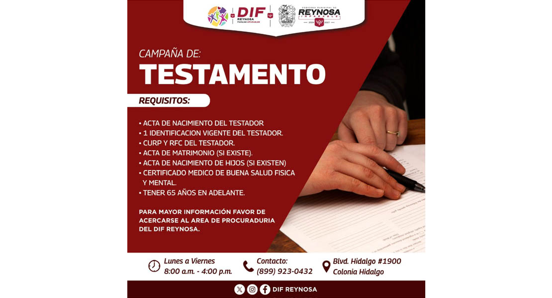 Reynosa, Tam.- El Sistema DIF-Reynosa que preside Carlos Luis Peña Garza y el Voluntariado que encabeza Alejandra Yelitza Garza, invitan a la población de 65 años en adelante a participar en la Campaña de Testamento, una iniciativa que busca promover la cultura de la previsión y fortalecer la seguridad jurídica de las familias.