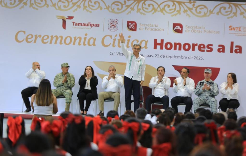 En la ceremonia cívica de honores, ante más de 400 alumnas, agregó que en Tamaulipas la transformación comienza en la escuela, “y a ustedes les corresponde garantizarlo”, afirmó.