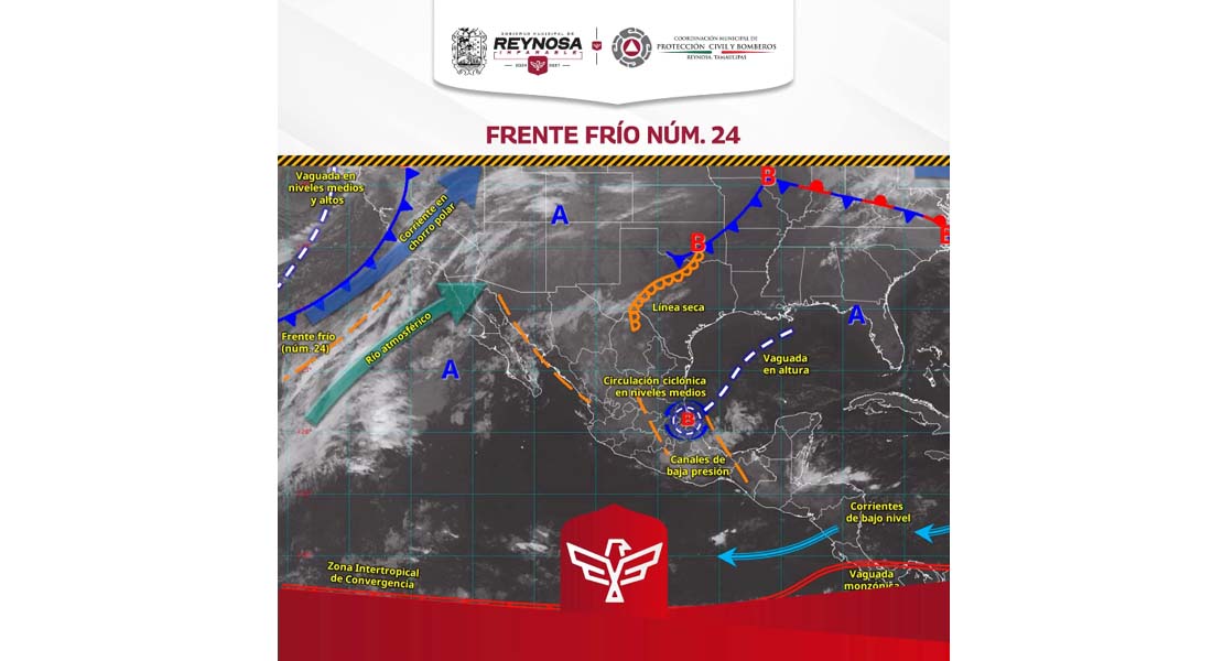 Reynosa, Tam.- La Coordinación de Protección Civil y Bomberos del Gobierno de Reynosa le da a conocer que, el Frente Frío Número 24, que arribó a esta frontera el día sábado 27 de diciembre, provocará un descenso en la temperatura hoy domingo 28, 11° Centígrados y más de 20% de probabilidad de lluvia.