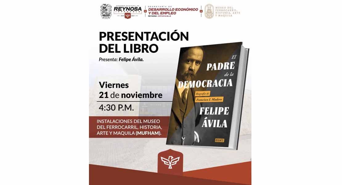 Reynosa, Tam.- El Presidente Municipal Carlos Peña Ortiz invita a la población en general a la presentación del libro «El Padre de la Democracia», biografía de Francisco I. Madero, escrita por el historiador Felipe Ávila.