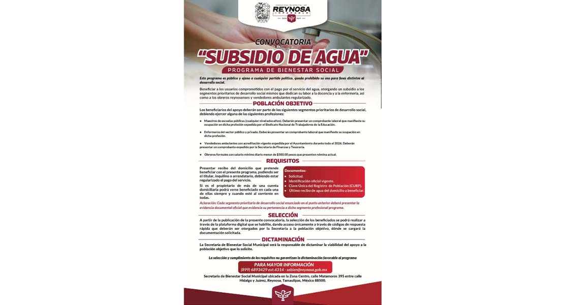 Reynosa, Tam.- El Alcalde Carlos Peña Ortiz invita a los usuarios del servicio de agua potable, a participar en el programa municipal «Subsidio de Agua», estrategia social que busca apoyar la economía de Maestros de escuelas públicas, Enfermeros del sector público y privado, vendedores ambulantes acreditados por el Ayuntamiento y con pagos de derechos al corriente, y obreros formales con salario mínimo diario no mayor a 500.00 pesos, que se encuentren al corriente con su recibo de consumo.