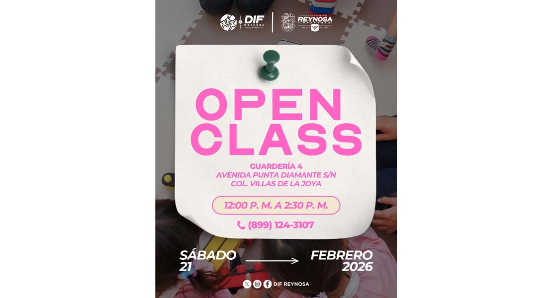 Reynosa, Tam.- El Sistema DIF-Reynosa que preside Carlos Luis Peña Garza, invita a madres y padres de familia, a participar en el Open Class que se realizará hoy sábado 21 de febrero en la Guardería 4, ubicada en avenida Punta Diamante s/n, en la colonia Villas de la Joya, en un horario de 12:00 del mediodía a 2:30 de la tarde, con el propósito de que las familias conozcan las instalaciones y el trabajo que se realiza con las niñas y niños.