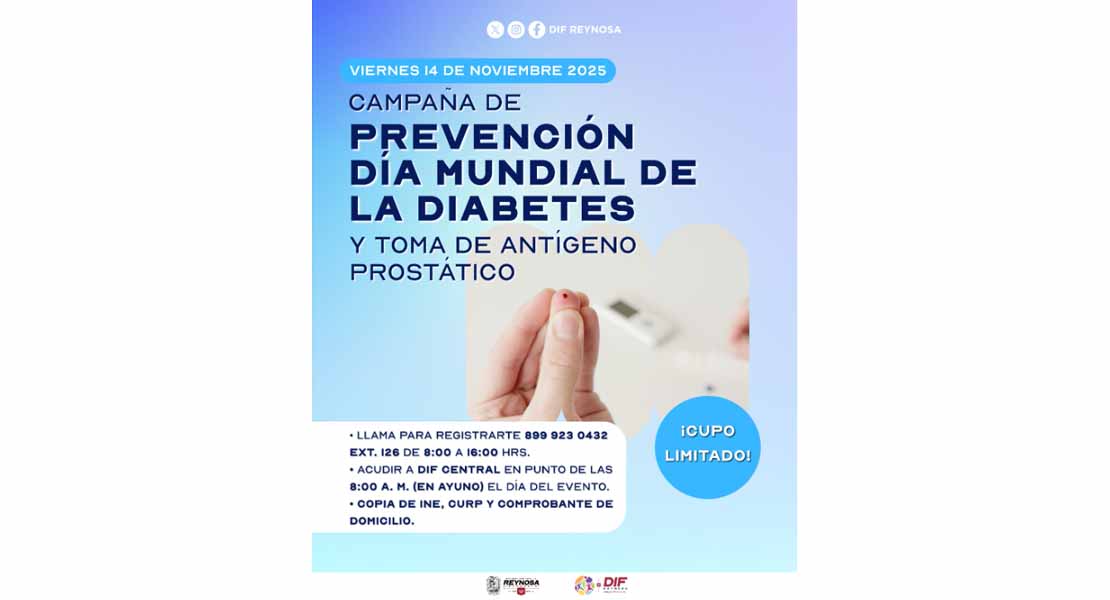 Reynosa, Tam.- El Sistema DIF-Reynosa, que preside Carlos Luis Peña Garza, invita a la ciudadanía a participar en la Campaña de Prevención “Día Mundial de la Diabetes” y Toma de Antígeno Prostático, que se llevará a cabo el viernes 14 de noviembre en las instalaciones del DIF Central ubicadas en bulevar Hidalgo número 1900 en la colonia Hidalgo, a partir de las 8:00 de la mañana