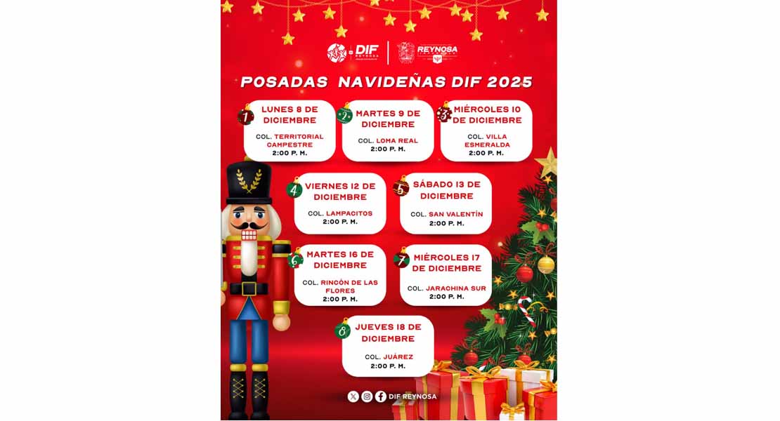 Las Posadas DIF se realizarán el lunes 8 de diciembre en la colonia Territorial Campestre; el martes 9 de diciembre en la colonia Loma Real; el miércoles 10 de diciembre en Villa Esmeralda; el viernes 12 de diciembre en colonia Lampacitos; el sábado 13 de diciembre en San Valentín; el martes 16 de diciembre en Rincón de las Flores; el miércoles 17 de diciembre en Jarachina Sur; y jueves 18 de diciembre en la colonia Benito Juárez.