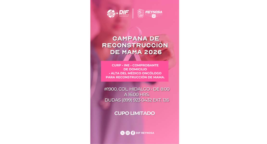 Reynosa, Tam.- Con el objetivo de contribuir al bienestar físico y emocional de las mujeres que han superado el cáncer de mama, el Sistema DIF-Reynosa que preside Carlos Luis Peña Garza, invita a registrarse en la Campaña de Reconstrucción de Mama 2026, que brinda la oportunidad de iniciar una nueva etapa con mayor confianza y calidad de vida, tras concluir su tratamiento oncológico.