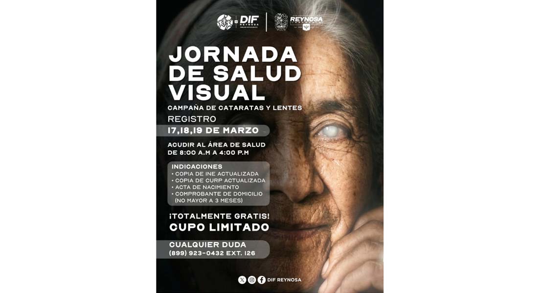 Reynosa, Tam.- El Alcalde, Carlos Peña Ortiz, a través del Sistema DIF-Reynosa que preside Carlos Luis Peña Garza, invita a la ciudadanía a registrarse en la Jornada de Salud Visual, donde se beneficiará a las familias con campaña de cataratas y entrega de lentes.
