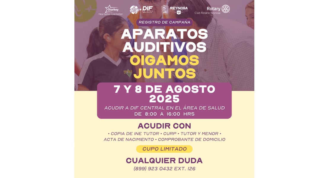 Reynosa, Tam.- Gracias al compromiso del Alcalde, Carlos Peña Ortiz, con el bienestar de las familias reynosenses, el Sistema DIF-Reynosa que preside Carlos Luis Peña Garza, en coordinación con el Club Rotary y la Fundación Starkey, invita a la ciudadanía a participar en la campaña “¡Oigamos Juntos!”, que busca apoyar a niñas, niños y adolescentes con algún grado de hipoacusia, brindándoles acceso a aparatos auditivos totalmente gratuitos.