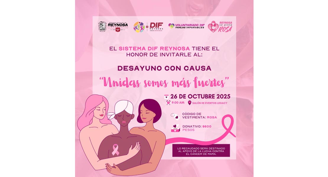 Reynosa, Tam.- El Sistema DIF-Reynosa que preside Carlos Luis Peña Garza y el Voluntariado DIF que encabeza Alejandra Yelitza Garza, invita a la sociedad civil, empresas, agrupaciones y ciudadanía a participar en el Desayuno con Causa “Unidas Somos Más Fuertes”, un evento diseñado para apoyar la lucha contra el cáncer de mama y brindar esperanza a mujeres valientes que enfrentan esta enfermedad.