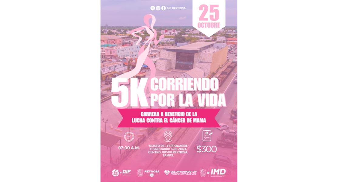 Reynosa, Tam.- El Alcalde Carlos Peña Ortiz hace una cordial invitación a la ciudadanía a participar en la Carrera 5K “Corriendo por la Vida”, organizada por el Sistema DIF Reynosa, a beneficio de la lucha contra el cáncer de mama.