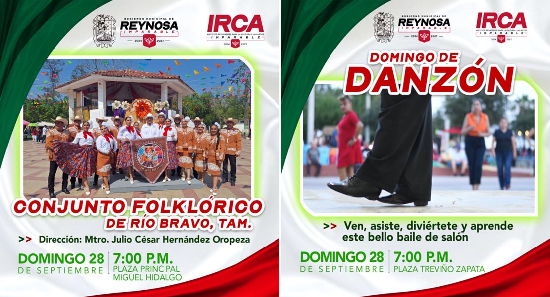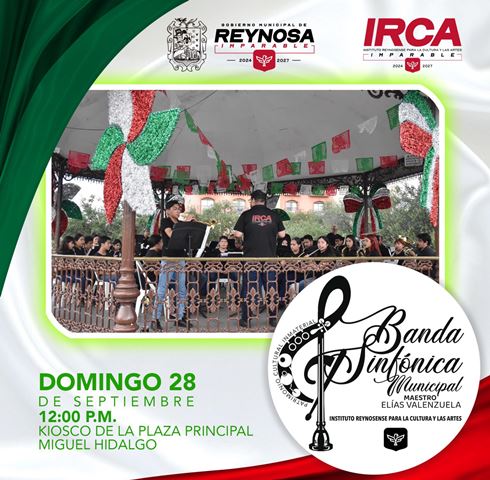 Reynosa, Tam.- Atendiendo las instrucciones del Alcalde Carlos Peña Ortiz, el Instituto Reynosense para la Cultura y las Artes presenta este domingo 28 de septiembre su agenda artística en plazas públicas de la ciudad.