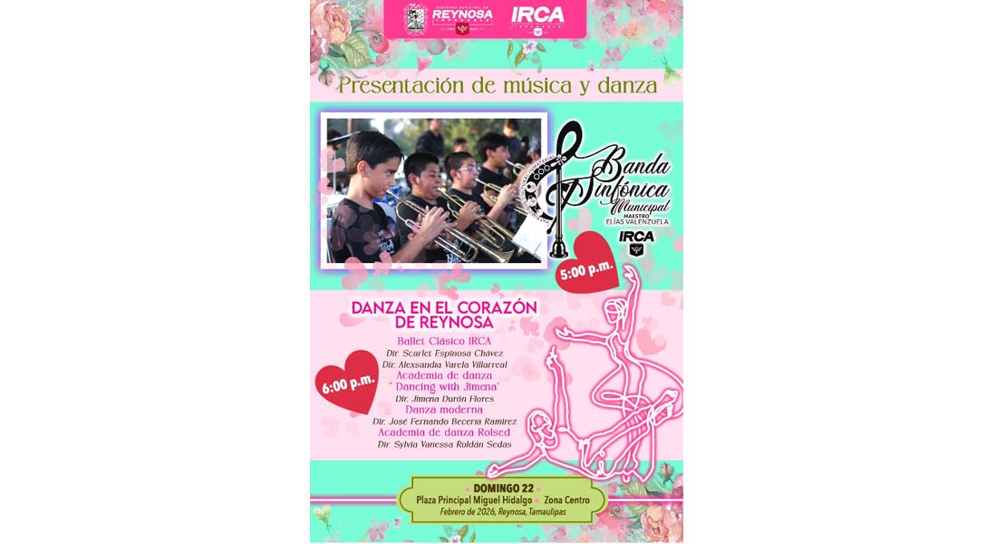 Reynosa, Tam.- El Gobierno de Reynosa, que preside el Alcalde Carlos Peña Ortiz, invita a la comunidad a disfrutar de un domingo cultural con música y danza este 22 de febrero en la plaza principal «Miguel Hidalgo», en la zona Centro.