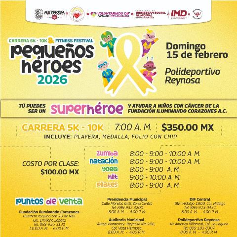 Con apoyo del Gobierno de Reynosa, la asociación que apoya a los niños con cáncer, organiza la Carrera 5K-10K Fitness Festival Pequeños Héroes 2026, que se celebrará el próximo 15 de febrero en el Polideportivo.