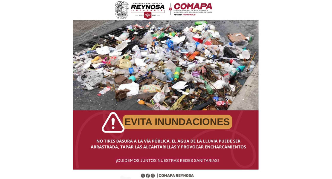 Reynosa, Tam.- La Comisión Municipal de Agua Potable y Alcantarillado de Reynosa reitera el llamado a la ciudadanía a tomar medidas de concientización, evitando arrojar basura y desechos a las vías públicas. Estas acciones contribuyen al buen funcionamiento de los sistemas de drenaje y al cuidado del entorno urbano.