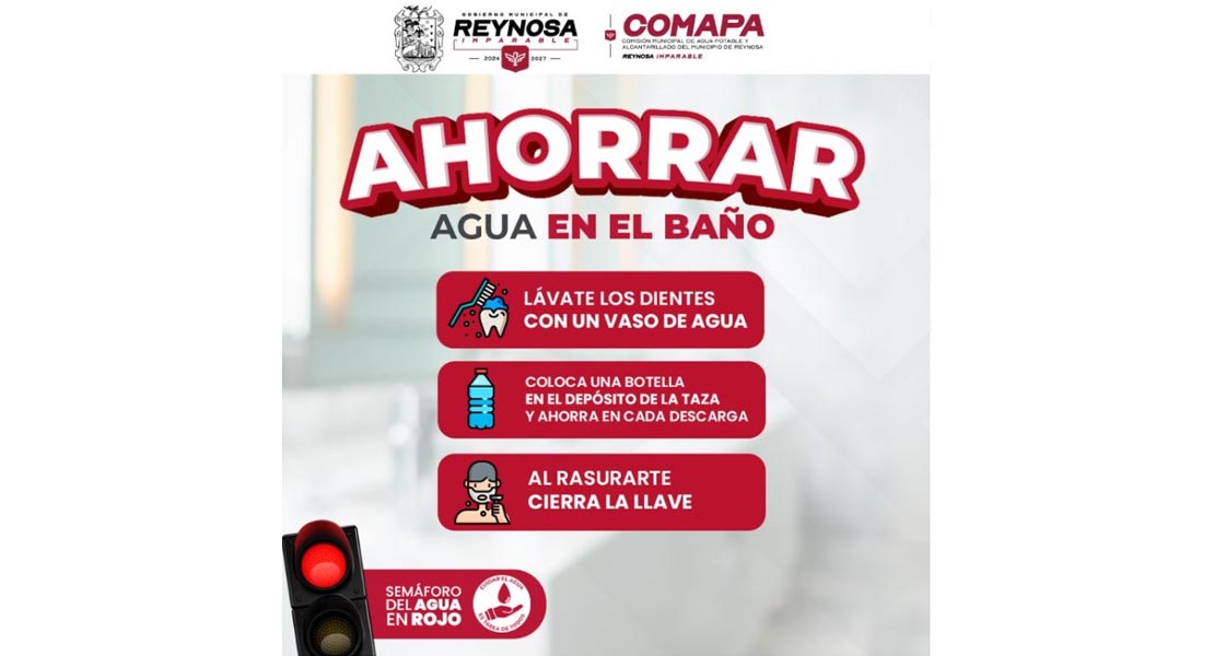 La Comisión Municipal de Agua Potable y Alcantarillado de Reynosa exhorta a la ciudadanía a adoptar hábitos sencillos que contribuyan al ahorro de este recurso vital en actividades diarias como el baño, el aseo personal o el uso del sanitario. Esto, debido a la poca disponibilidad de agua que hay en la región en esta temporada, la cual mantiene a la ciudad en semáforo rojo del agua.
