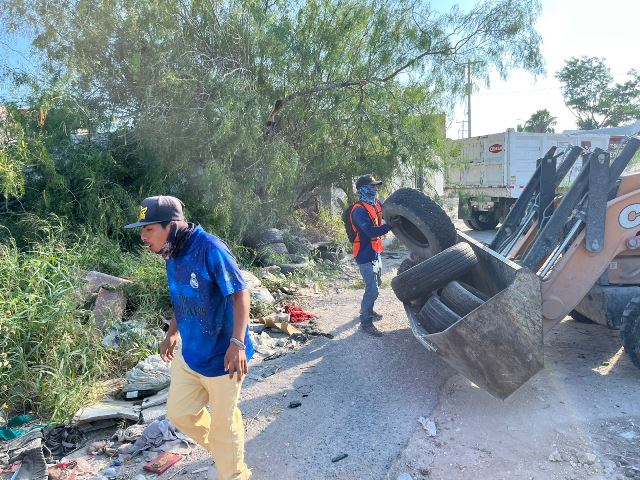 Reynosa, Tam.- El Gobierno Municipal del Presidente Carlos Peña Ortiz ejecuta labores de limpieza en el bulevar Monte de los Olivos, del fraccionamiento Puerta Grande, sitio que cientos de personas han convertido en basurero clandestino, poniendo en riesgo la salud y seguridad de la población.