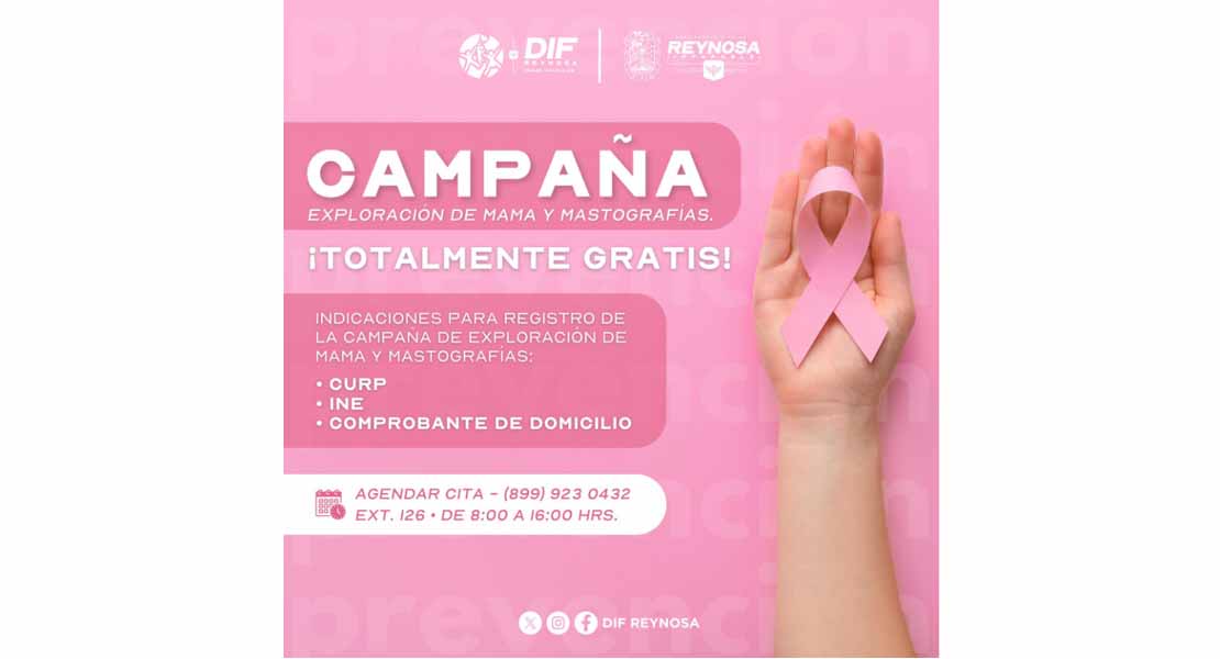 Reynosa, Tam.- Por instrucciones del Presidente Municipal, Carlos Peña Ortiz, el Sistema DIF-Reynosa que preside Carlos Luis Peña Garza, la campaña gratuita de Exploración de Mama y Mastografías, permanecerá vigente durante lo que resta del año, con el objetivo de seguir promoviendo la detección oportuna del cáncer de mama y fortalecer la salud de las mujeres reynosenses.