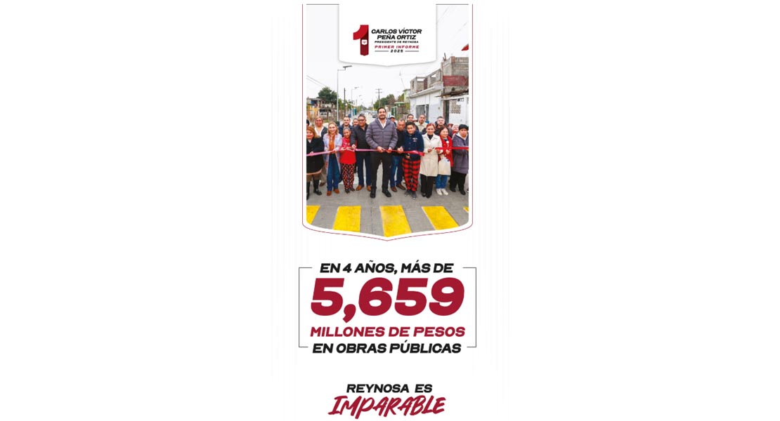 Reynosa, Tam.- El Gobierno del Presidente Carlos Peña Ortiz invirtió en cuatro años más de 5,659 Millones de Pesos en proyectos que mejoran la infraestructura y el equipamiento de la ciudad porque en obra pública, Reynosa es Imparable.